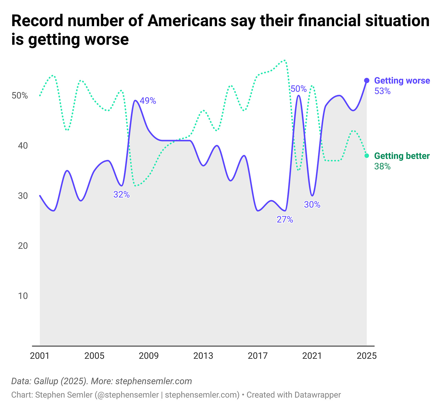 ^Alt text for screen readers: Record number of Americans say their financial situation is getting worse. This graph shows the percent of Americans who say their financial situation is getting worse (purple line) versus getting better (green line) since 2001. In 2025, 53% said it’s getting worse and 38% said it’s getting better. Data: Gallup.