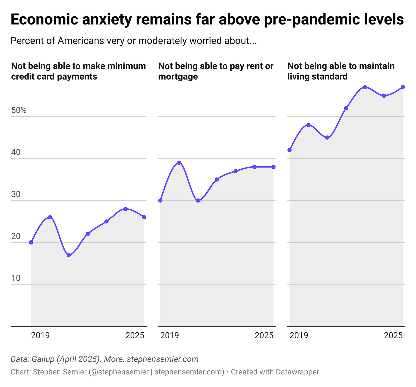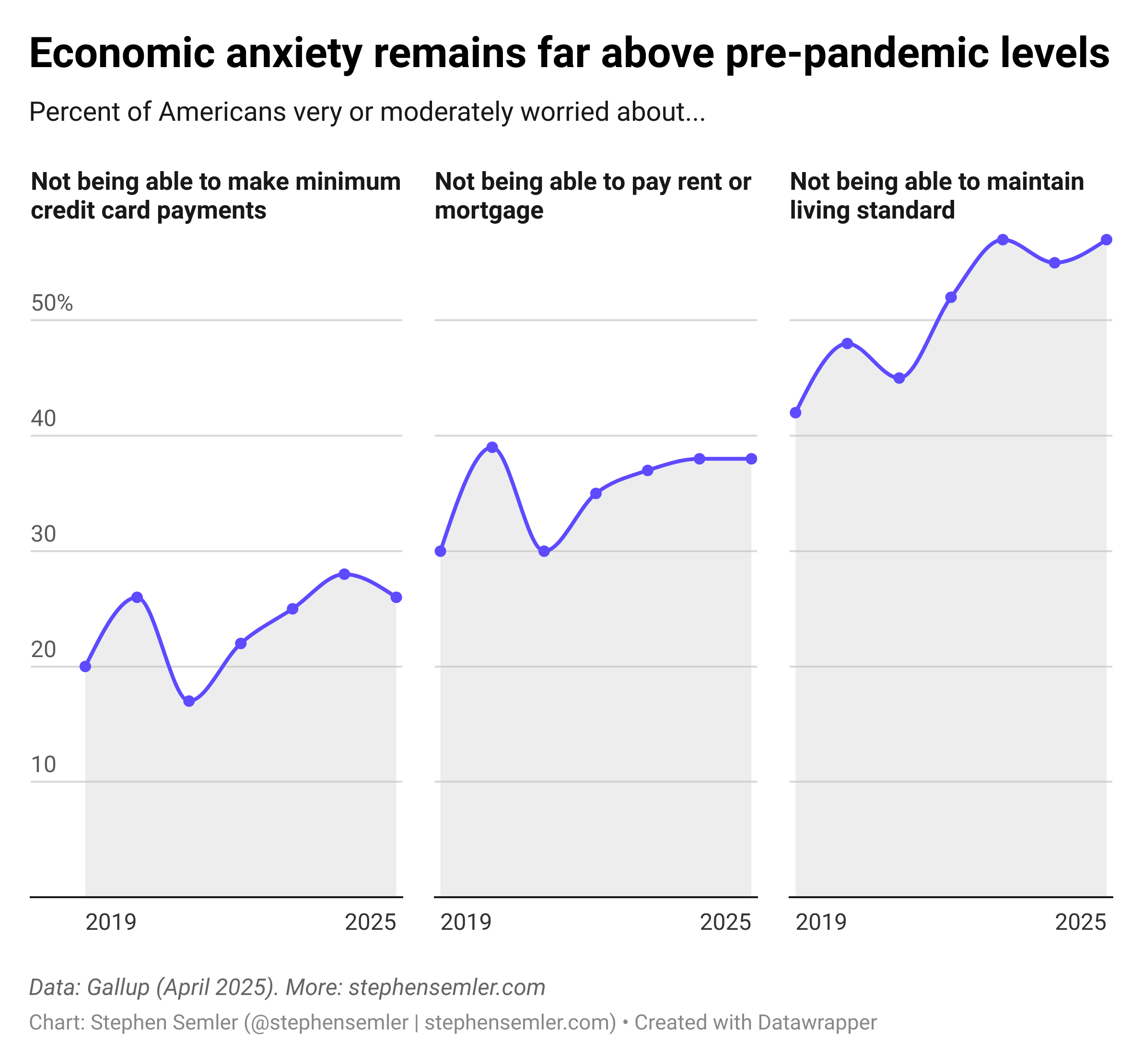 ^Alt text for screen readers: Economic anxiety remains far above pre-pandemic levels. This graph shows the percent of Americans very or moderately worried about not being able to make minimum credit card payments, pay rent or mortgage, or maintain their standard of living from 2019 to 2025. All three show a dip in 2021 before climbing beyond 2019’s levels. Data: Gallup.