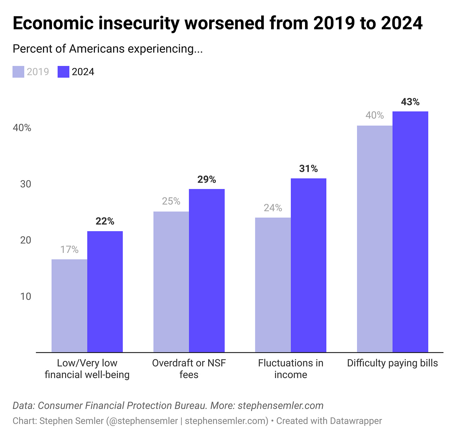 ^Alt text for screen readers: Economic insecurity worsened from 2019 to 2024. This graph compares 2019 and 2024 across four barometers of financial difficulty. The numbers refer to the percent of the U.S. population experiencing each difficulty. Low/very low financial well-being: 17% in 2019, 22% in 2024. Overdraft or NSF fees: 25%, 29%. Fluctuations in income: 24%, 31%. Difficulty paying bills: 40%, 43%. Data: Consumer Financial Protection Bureau.