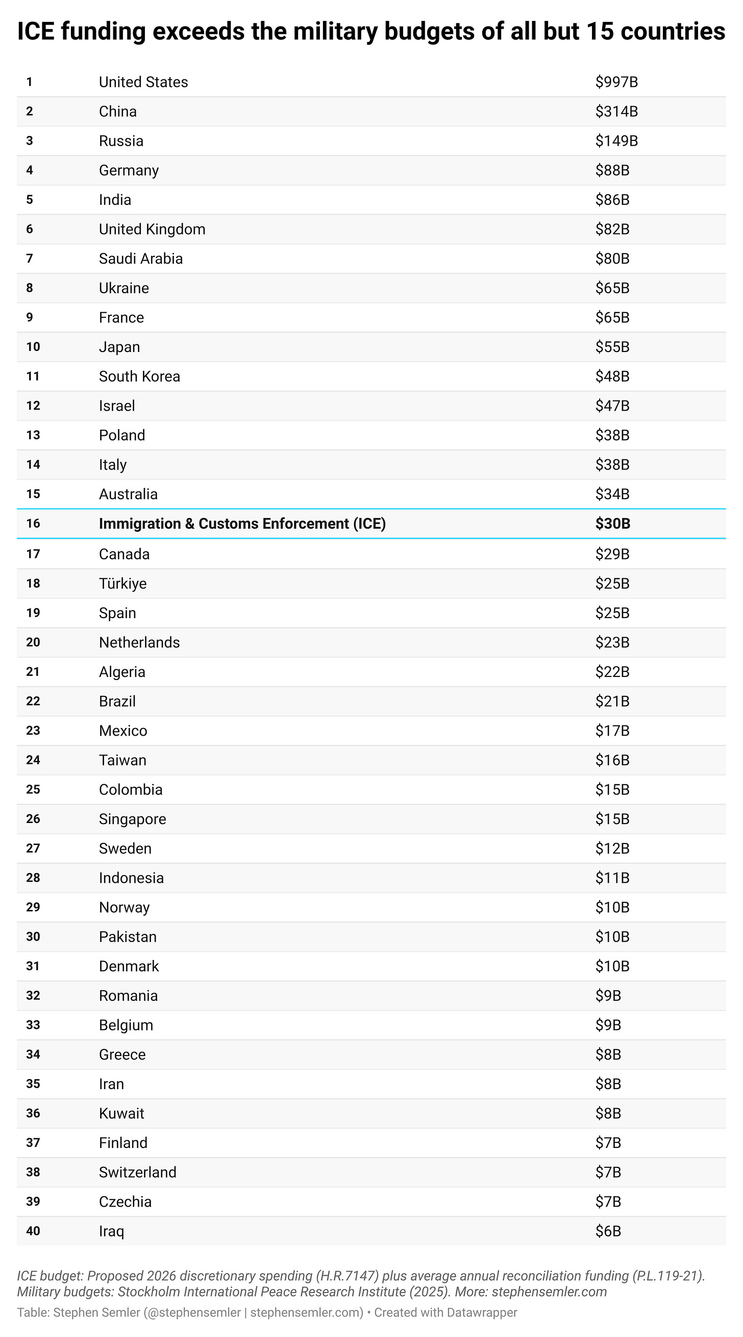^Alt text for screen readers: ICE funding exceeds the military budgets of all but 15 countries. This table ranks the proposed $30 billion ICE budget for 2026 among the largest military budgets worldwide. It has 3 columns — ranking, military or agency, and funding — and 40 rows, 39 of which are country military budgets and 1 is the ICE budget. ICE is ranked 16th, larger than the military budgets of countries including Canada, Spain, Brazil, Mexico, Sweden, Iran, and Switzerland. The ICE budget refers to the proposed 2026 discretionary spending in H.R.7147 plus average annual reconciliation funding in P.L.119-21. Military budgets are sourced from the Stockholm International Peace Research Institute.