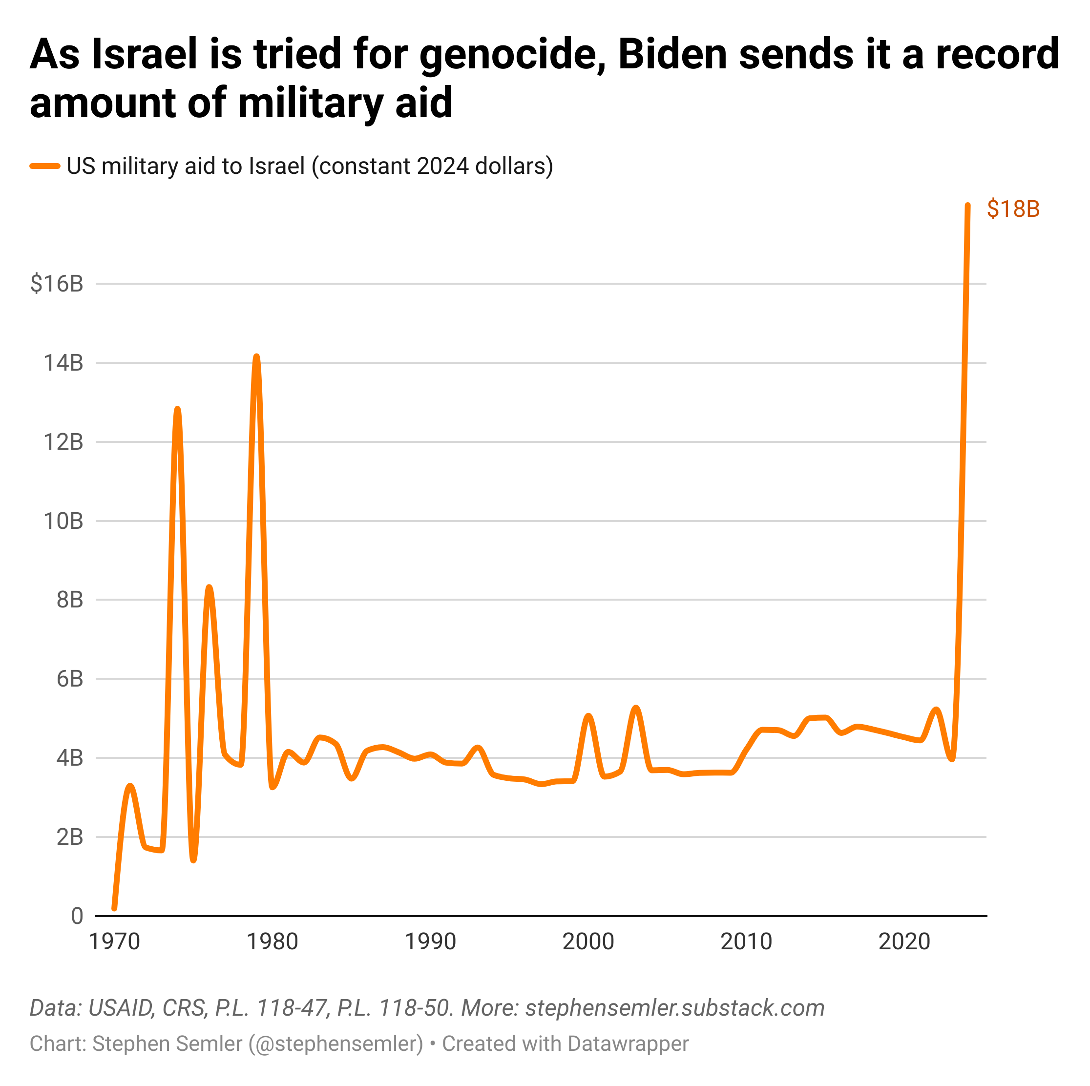 ^Alt text for screen readers: As Israel is tried for genocide, Biden sends it a record amount of military aid. This line graph shows US military aid to Israel from 1970 to 2024 in constant 2024 dollars. There are peaks in 1974, 1976, and 1979 and then the line hovers around $4 billion for the next 40-something years before shooting up to the $18 billion mark in 2024. Data: USAID, Congressional Research Service, Public Laws 118-47 and 118-50.