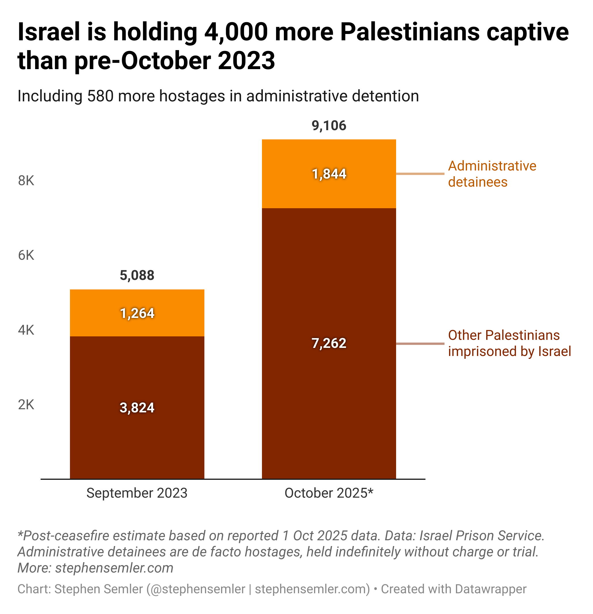 ^Alt text for screen readers: Israel is holding 4,000 more Palestinians captive than pre-October 2023. Including 580 more hostages in administrative detention. September 2023 column: 5,088 total prisoners, including 1,264 administrative detainees and 3,824 other Palestinians imprisoned by Israel. October 2025 column: 9,106 total prisoners, including 1,844 administrative detainees and 7,262 other Palestinians imprisoned by Israel. Post-ceasefire estimate based on reported 1 October 2025 data. Data: Israel Prison Service. Administrative detainees are de facto hostages, held indefinitely without charge or trial. Chart: Stephen Semler.