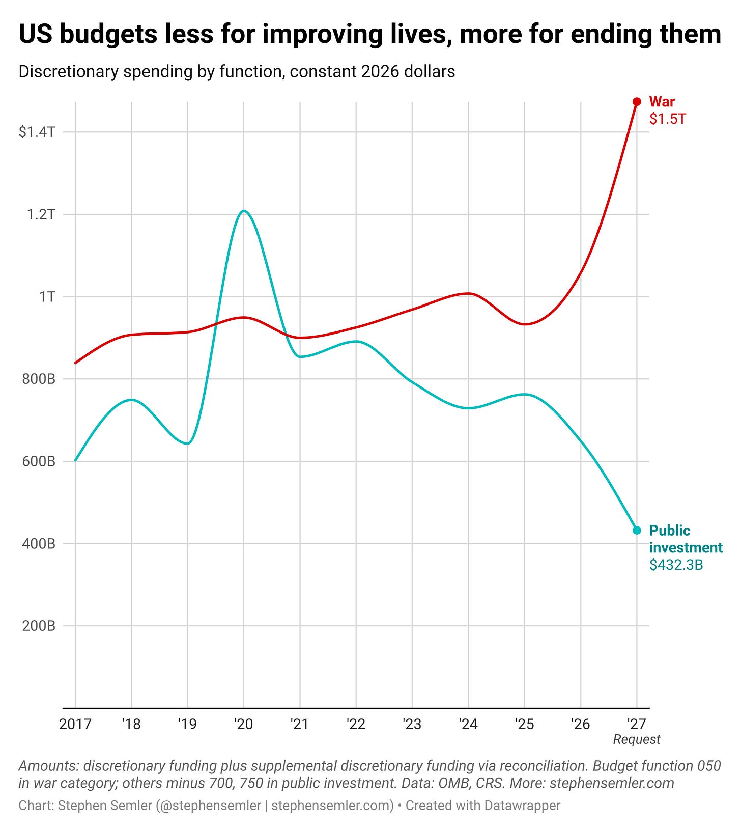 ^Alt text for screen readers: US budgets less for improving lives, more for ending them. Discretionary spending by function, constant 2026 dollars. This chart shows war spending increasing steadily since 2017 and shows public investment spending peaking in 2020 before steadily falling ever since. Trump’s 2027 budget includes $1.5 trillion in war spending and only $432.3 billion in public investment. Amounts reflect discretionary funding plus supplemental discretionary funding via reconciliation. Budget function 050 in war category; others minus 700, 750 in public investment. Data: Office of Management and Budget, Congressional Research Service.