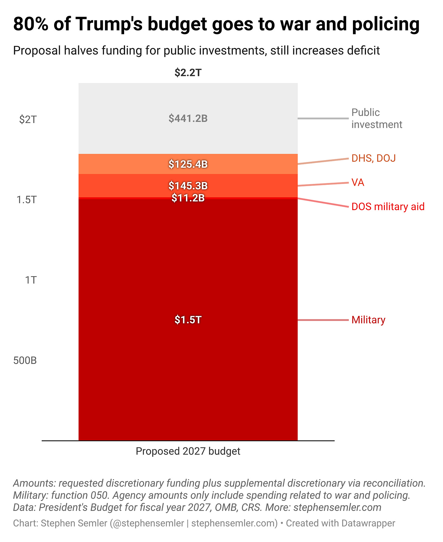 ^Alt text for screen readers: 80% of Trump’s budget goes to war and policing. Proposal halves funding for public investments, still increases deficit. The red-orange stacked column chart is as follows: Military, $1.5 trillion; Department of State military aid, $11.2 billion; Department of Veterans Affairs, $145.3 billion; Departments of Homeland Security and Justice, $125.4 billion; Other, $441.2 billion. Amounts: requested discretionary funding plus supplemental discretionary via reconciliation. Military: budget function 050. Agency amounts only include funding related to war and policing. Data: President’s Budget for fiscal year 2027, Office of Management and Budget.