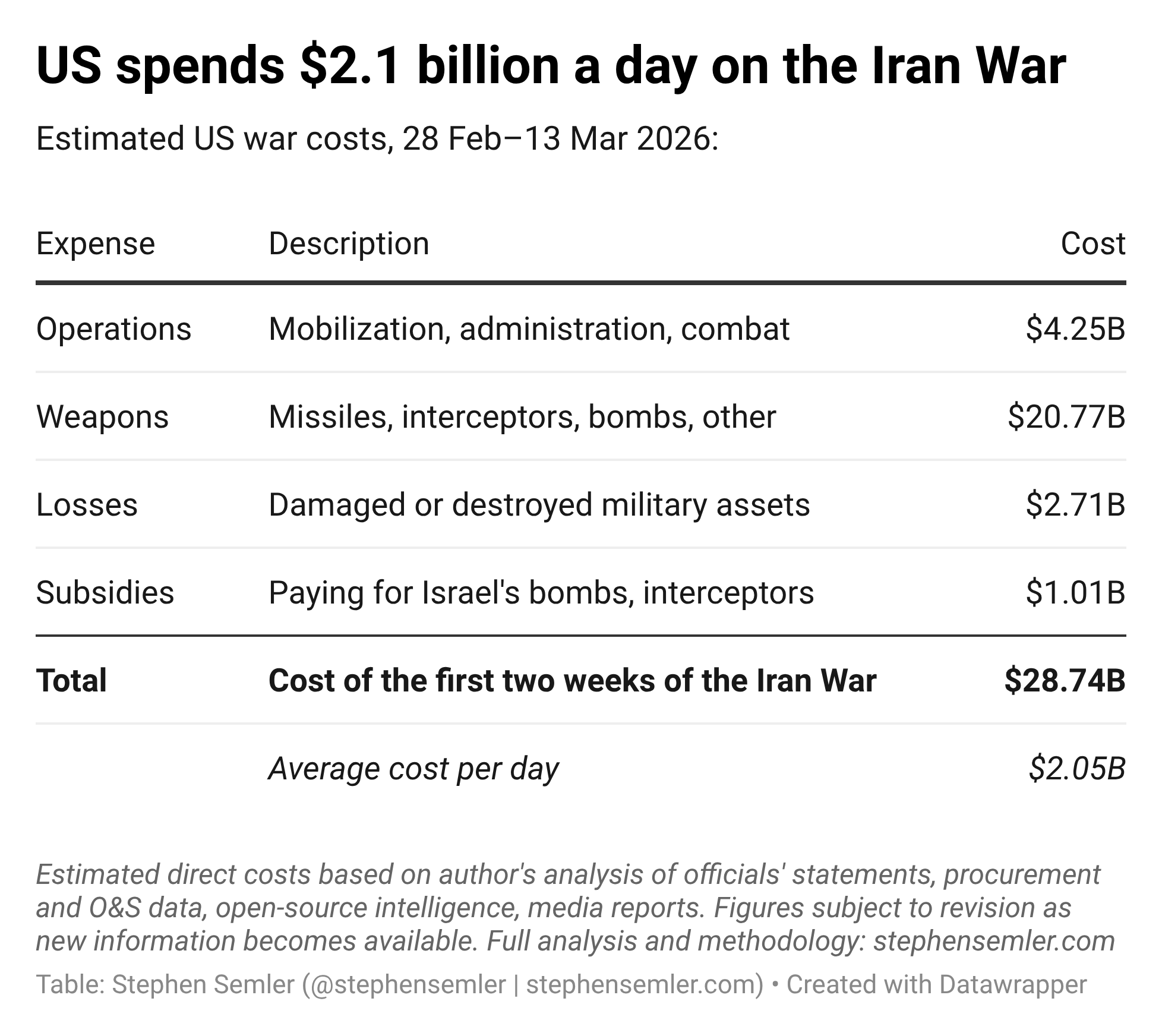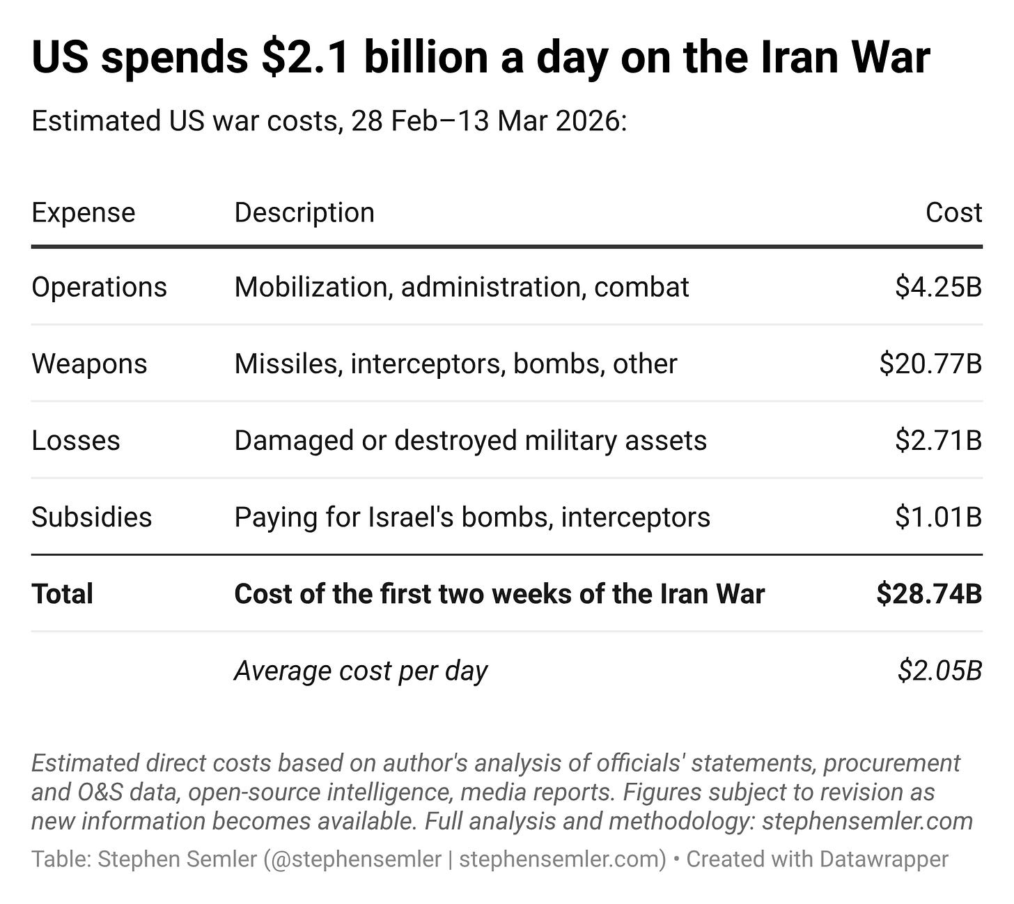 ^Alt text for screen readers: US spends $2.1 billion a day on the Iran War. Estimated US war costs, 28 February–13 March 2026. Table format: Expense; Description; Cost. Rows: Operations; Mobilization, administration, combat; $4.25 billion. Weapons; Missiles, interceptors, bombs, other; $20.77 billion. Losses; Damaged or destroyed military assets; $2.71 billion. Subsidies; Pay for Israel’s bombs, interceptors; $1.01 billion. Total; Cost of the first two weeks of the Iran War; $28.74 billion. Average cost per day: $2.05 billion. Estimated direct costs based on author’s analysis of officials’ statements, procurement and O&S data, open-source intelligence, media reports. Figures subject to revision as new information becomes available.